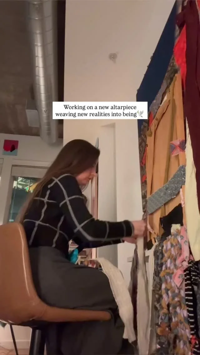 Rooted in yogic philosophy and dream practice, her wall-based pieces emerge from the same contemplative rhythm: breath as brushstroke, stitch as repair, repetition as prayer. Her paintings ask for a kind of seeing that begins in the body rather than the mind. By working with recycled fabrics, she also addresses the environmental impact of the textile industry, transforming post-consumer remnants into portals of presence and care. Whether working on paper, cloth, or large-scale installations, her process bridges the personal and the planetary, revealing how sustained individual attention becomes a force for collective change.